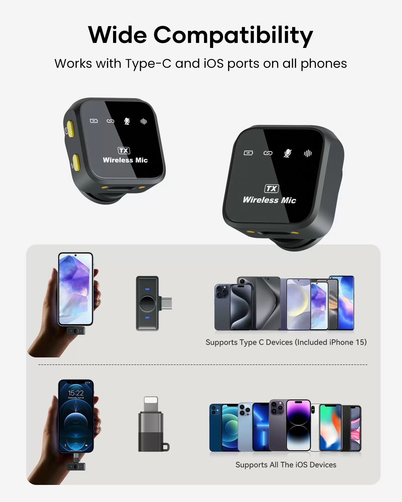 【Universal Compatibility for iPhone, Android, Laptop & More】Works seamlessly with iPhone 15 (USB-C), older iPhones (Lightning), Android devices, iPads, and laptops. Whether you need a reliable microphone for iPhone, a wireless lavalier for Android, or a phone mic for TikTok, YouTube, or Zoom—this kit has you covered.